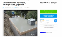 "Бункер, бомбоубежище, укрытие – размеры любые от 9 метров. Строим под ключ, быстро, качественно. Не откладывайте на завтра, заказывайте прямо сейчас!" – написал автор объявления Николай, подчеркнув, что собственное бомбоубежище на собственном участке поможет укрыться от агрессоров.