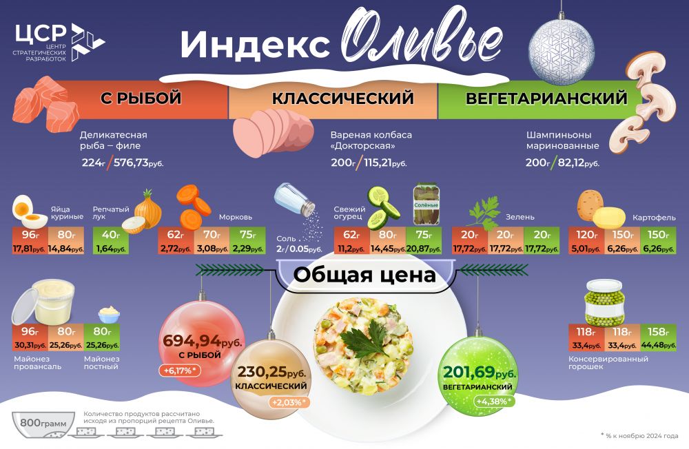 Согласно анализу Центра стратегических разработок, стоимость наборов продуктов для популярных рецептов салата «Оливье» (классического с колбасой, с рыбой и вегетарианского) в этом году увеличилась меньше, чем общая инфляция. В комплекты входят традиционные ингредиенты, и в текущем сезоне зафиксировано снижение цен на яйца, картофель, морковь, огурцы и лук. Несмотря на колебания, салат остается хитом новогоднего стола, поэтому эксперты предлагают адаптированные рецепты с учетом предпочтений потребителей.