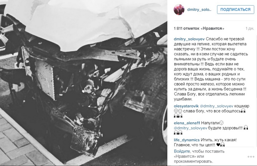 - Спасибо нетрезвой девушке, которая вылетела на встречку. Этим постом хочу сказать, ни в коем случае не садитесь пьяными за руль и будьте очень внимательны. Ведь если вам не дорога ваша жизнь, подумайте о тех, кого ждут дома, о ваших родных и близких. Ведь машина — это по сути своей просто железо, которое можно купить за деньги, а жизнь бесценна. Слава богу, все отделались легкими ушибами, - написал у себя на странице Дмитрий Соловьев.