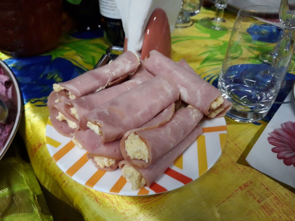 Рулетики из ветчины с сырной начинкой. Яйца фаршированные красной рыбой (можно заменить на печень трески или консервированную горбушу). Печеночный рулет с начинкой из морковки и лука или печеночный тортик. Холодец.