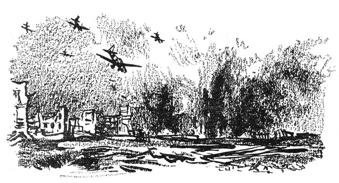 «Немцы летят прямо на нас. Они летят треугольником, как перелетные гуси. Летят низко – видны желтые концы крыльев, обведенные белым кресты, шасси, точно выпущенные когти. Десять… двенадцать… пятнадцать… восемнадцать штук… Выстраиваются в цепочку. Как раз против нас. Ведущий переворачивается через крыло колесами вверх. Входит в пике. Я не свожу с него глаз. У него красные колеса и красная головка мотора. Включает сирену. Из-под крыльев вываливаются черные точки. Одна… две… три… четыре… десять… двенадцать… Последняя белая и большая. Я закрываю глаза, вцепляюсь в перила. Это инстинктивно. Нету земли, чтобы в нее врыться. А что-то надо. Слышно, как «певун» выходит из пике. Потом ничего нельзя уже разобрать.