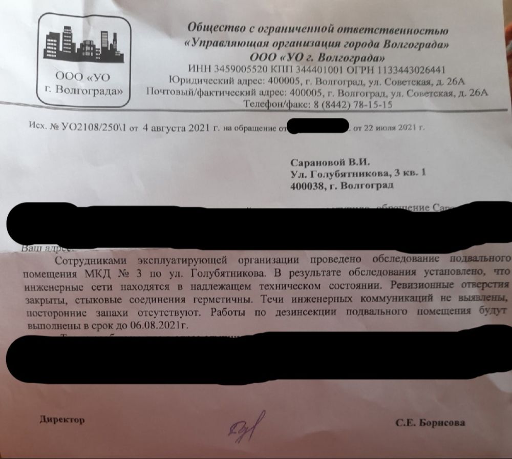 "Сотрудниками эксплуатирующей организации проведено обследование подвального помещения МКД №3 по ул. Голубятникова. В результате обследования установлено, что инженерные сети находятся в надлежащем техническом состоянии. Ревизионные отверстия закрыты, стыковые соединения герметичны. Течи инженерных коммуникаций не выявлены, посторонние запахи отсутствуют. Работы по дезинсекции подвального помещения будут выполнены в срок до 06.08.2021 г.", - говорится в ответном письме, подписанном директором УК С.Е. Борисовой.