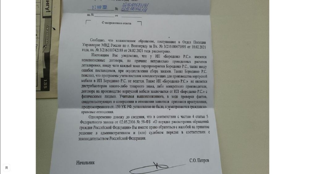 "В настоящее время в различные подразделения полиции г. Волгограда и Волгоградской области (ОП № 2 УМВД России по г. Волгограду, ОП № 4 УМВД России по г. Волгограду, УМВД России по г. Волгограду, ОП № 3 УМВД России по г. Волжскому Волгоградской области, УМВД России по г. Волжскому Волгоградской области) и другие подразделения полиции г. Волгограда направлено более 19 заявлений граждан о противоправных действиях Бородавко Р.С., в том числе коллективные обращения. Так в ОП № 2 УМВД России по г. Волгограду подавалось коллективное обращение пострадавших от действий Бородавко Р.С., подана жалоба в прокуратуру Краснооктябрьского района г. Волгограда, на решения принятые по заявлениям граждан, по итогам рассмотрения которых вынесены представления об устранении нарушений законодательства, однако никаких действий сотрудники полиции ОП № 2 УМВД России по г. Волгограду не предпринимают. В настоящее время нами поданы коллективные обращения в ГУ МВД России по Волгоградской области, прокуратуру Волгоградской области, депутатам. Ответ от ГУ МВД России по Волгоградской области на коллективное обращение от 2 августа 2021 года не заставил себя ждать, поскольку наше обращение передано в УМВД России по г. Волгограду, где 10 августа 2021 года было рассмотрено и зарегистрировано в КУСП и 16 августа 2021 года вновь направленно начальнику ОП № 2 УМВД России по г. Волгограду Петрову С.О. для проведения дальнейшей проверки и принятия законного решения. Вновь наше обращение передается в территориальный орган одного района, несмотря на то что свою противоправную деятельность Бородавко Р.С. осуществляет на территории всего города Волгограда, в том числе Волгоградской области. Как будет проведена проверка и какое законное решение будет принято мы уже предполагаем.