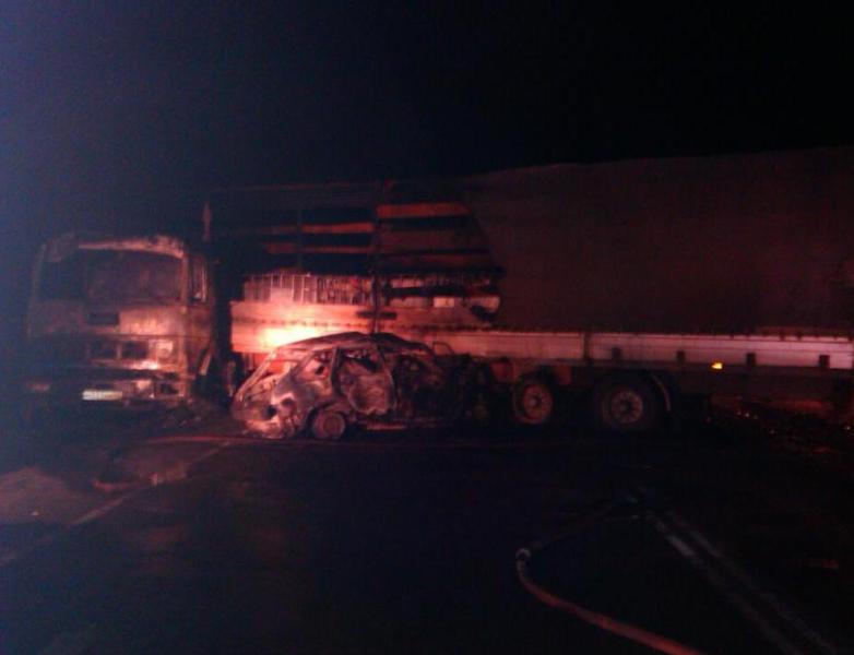 После удара загорелись и большегруз, и легковой автомобиль.