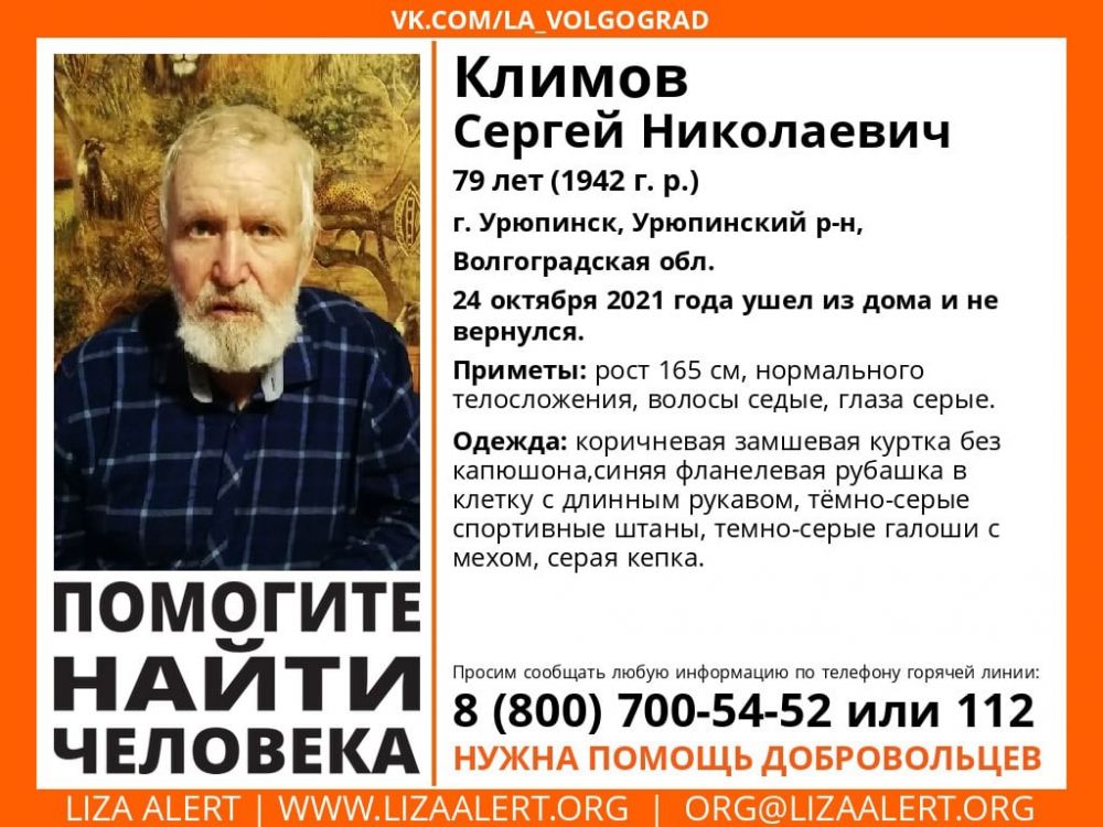 Как сообщает интернет-газета "Кривое-зеркало", сотрудники полиции и волонтеры поискового отряда "Лиза Алерт"разыскивают пропавшего Сергея Климова. 79-летний мужчина пропал 24 октября в Урюпинске Волгоградской области. Он вышел из дома и не вернулся. До сих пор о местонахождении Сергея Николаевича ничего не известно.