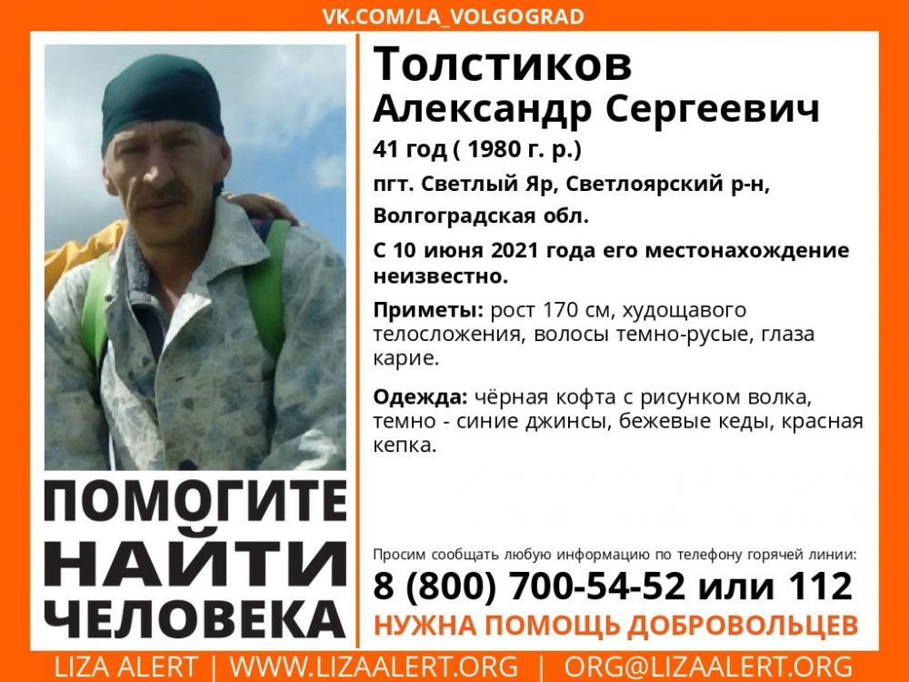 Как сообщает интернет-газета "Кривое-зеркало", сотрудники полиции и волонтеры поискового отряда "Лиза Алерт" ведут поиск пропавшего Александра Толстикова. 41-летний мужчина пропал 10 июня текущего года в пгт. Светлый Яр, Светлоярского района Волгоградской области и до сих пор о местонахождении пропавшего ничего не известно.