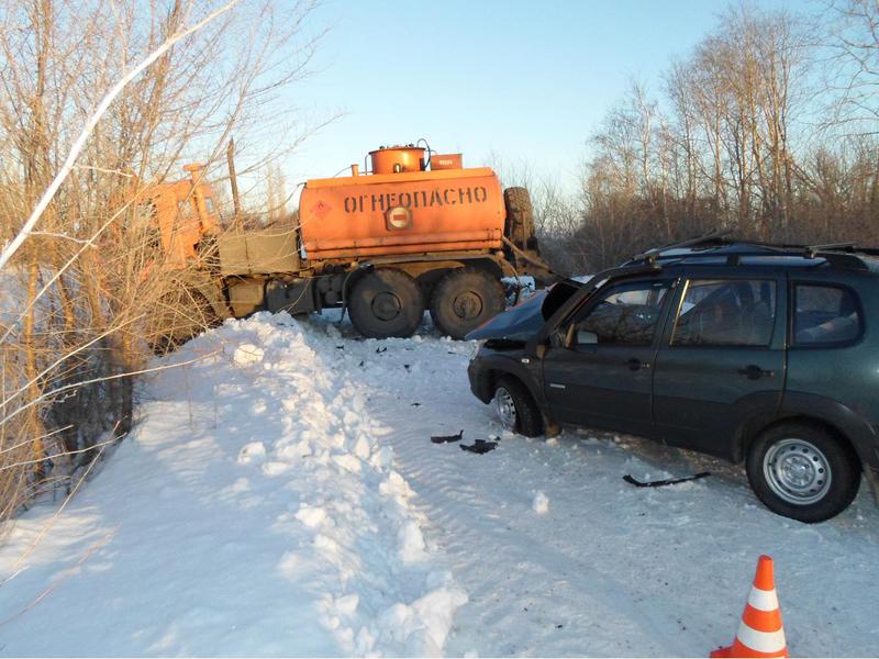 Это ДТП произошло в Урюпинском районе Волгоградской области в 16:00 четверга, 22 января. 67-летний местный житель за рулем «Нивы Шевроле» не справился с управлением на заснеженной дороге. Машину вынесло на встречную полосу прямо на автоцистерну «НЕФАЗ-66061-13». 38-летний водитель цистерны пытался уйти от столкновения, однако это у него не получилось.