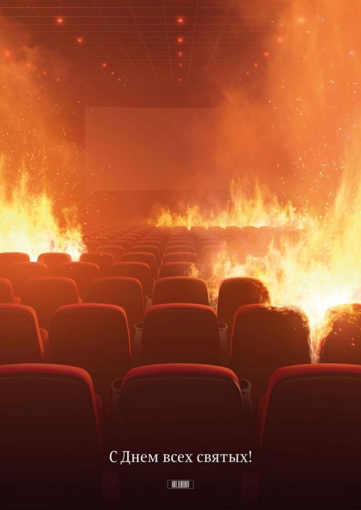 Компании «Студия Артемия Лебедева» обнародовала открытку к Хеллоуину в Instagram, на которой изображен горящий зал кинотеатра.