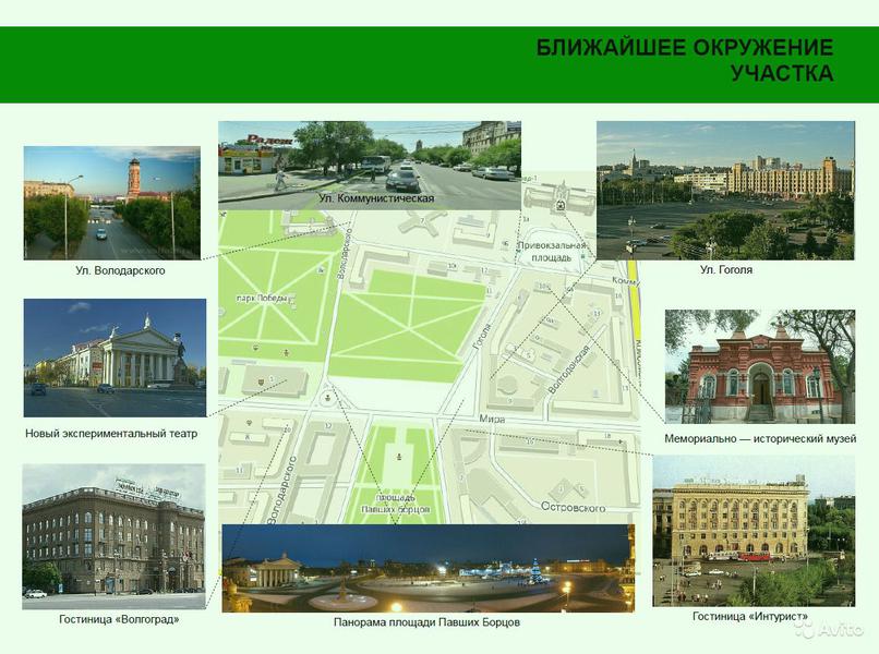 «Земельный участок из земель населённых пунктов расположен: Волгоградская обл. г. Волгоград в Центральном районе, в границах ул. Мира, ул. им. Володарского, ул. Коммунистическая, ул. им. Гоголя, за трибунной частью площади Павших Борцов, в самом центре города. Кадастровый номер 34:34:040033:849 с разрешенным использованием: многофункциональный центр. Площадь 19735 кв.м. Договор аренды на 3 года. Есть разрешение и проектно- сметная документация для строительства двух 4-х этажных торгово-офисных и развлекательных комплексов. При необходимости, возможно выкупить действующий магазин «МАН», примыкающий к искомому участку со стороны ул. Гоголя. На аренду, в дальнейшем построенных, офисных помещений претендует городская администрация Волгограда. Снизится проблема стоянки и парковки в самом центре города, если сделать подземную платную парковку по образцу и подобию, как в Москве в центре на Тверской (с дальнейшей продажей парковочных мест). Цена переуступки права аренды земельного участка составляет 350 млн. руб. со всеми налогами. Возможны другие варианты сотрудничества».