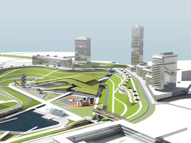 Автором первого варианта является архитектор Александр Буров. Он предлагает разместить на территории поймы многофункциональный парк. Главным элементом является каскад искусственных водоемов. В парке планируются разместить спортивные и развлекательные комплексы, объекты обслуживания, а в глубине поймы — аквапарк и парк аттракционов.