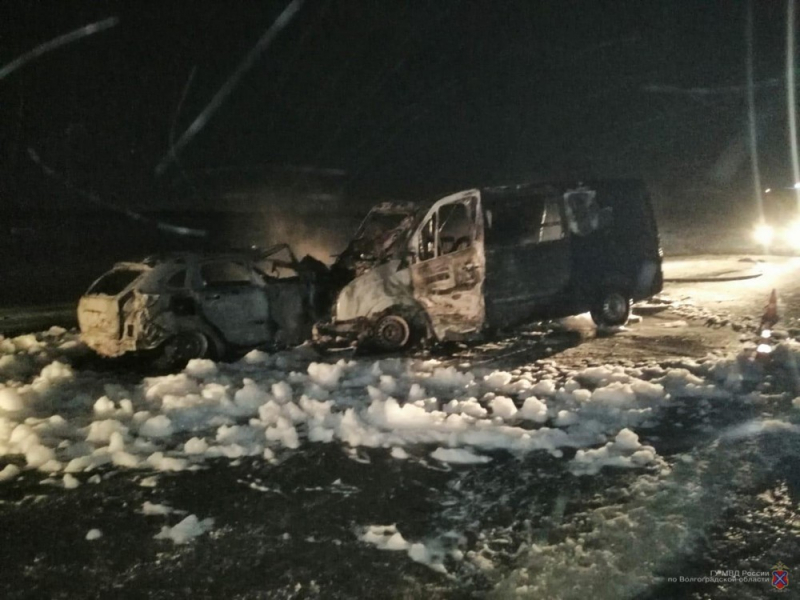 В Волгоградской области на трассе загорелись автомобили после лобового столкновения