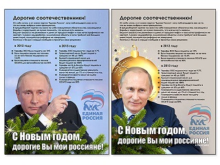 На плакатах, размещенных на сайте "Росагита", имя Путина не упоминается, однако есть его изображение на фоне новогодней символики и логотипа партии "Единая Россия". Плакаты оформлены по-разному, но текст, написанный от первого лица, в них полностью совпадает. Начинается "поздравление" обращением к "дорогим соотечественникам", которых президент от себя лично и от имени ЕР благодарит за то, что они снова выбрали его на высокий пост. Затем следует отчет по росту цен за 2012 год и обещание поднять все виды налогов и тарифов в будущем году.