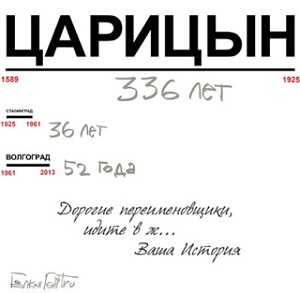 Вот и Всемирный русский народный собор поспешил поддержать идею вернуть Волгограду имя, с которым он пришел в историю XX века. По мнению представителей ВРНС, возвращенное городу имя олицетворяет собой эпоху, "которая при всей ее противоречивости и драматизме является неотъемлемой частью победоносного русского прошлого".
