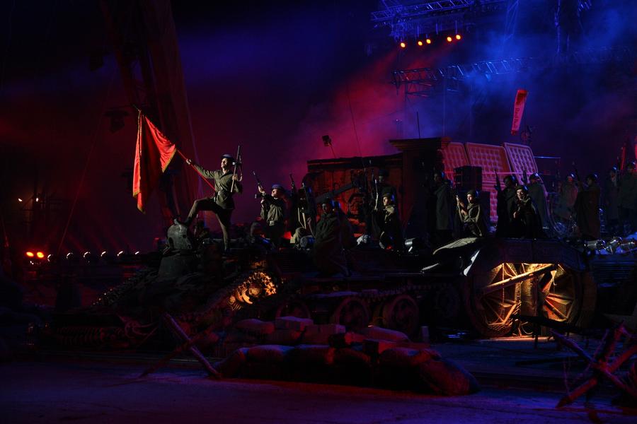 В конце боя на сцене появился советский танк, и символом победы взвилось красное знамя. Масштабное действо сопровождалось музыкальными композициями, и стихами.