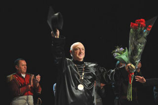Соответствующая мантия, конфедератка и Диплом установленного образца ему вручил президентом Международной академии театра Дмитрий Власов. Свидетелями этого церемониала стали зрители премьерного спектакля «Цареубийцы» - это был 12-й показ новой работы театра в постановке Отара Джангишерашвили. Зал был полон, и взорвался очередным валом аплодисментов, когда было объявлено, для чего приглашается на сцену гость из Москвы.